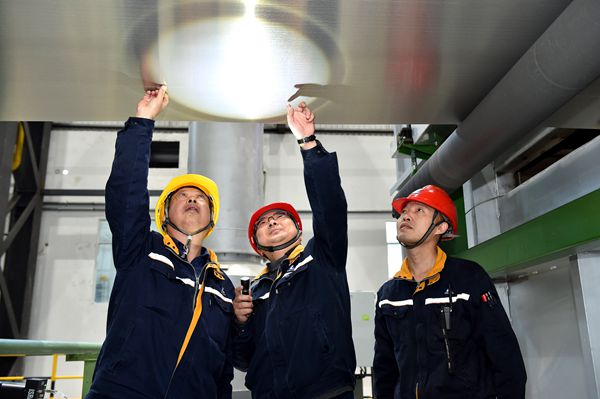 西南鋁技術員查看熱處理爐鋁板表面質(zhì)量。李影攝