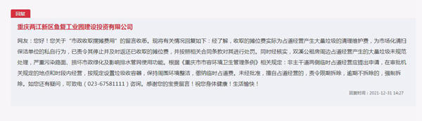 針對留言,重慶兩江新區(qū)魚復工業(yè)園建設投資有限公司回復,經了解,收取的攤位費實際為占道經營產生大量垃圾的清理維護費,為市場化清掃保潔單位的私自行為,已責令其停止并及時返還已收取的攤位費,并按照相關合同條款對其進行處罰。