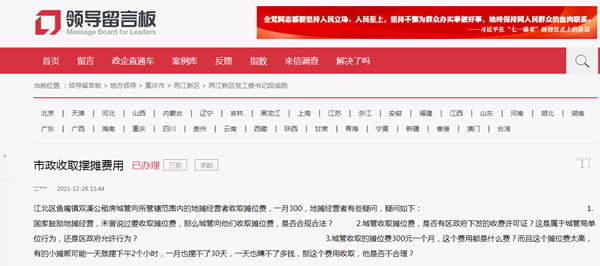 “國家鼓勵地攤經營,未曾說過要收取攤位費,那么收取攤位費,是否合規(guī)合法?”2021年12月26日,網友在人民網“領導留言板”上給重慶市兩江新區(qū)黨工委書記段成剛留言,對江北區(qū)魚嘴鎮(zhèn)雙溪公租房城管所管轄范圍內的地攤經營者收取“攤位費”,一個月300元,這樣行為提出疑問。
