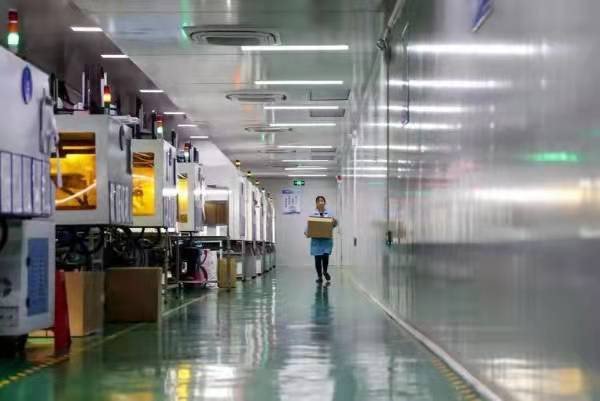 員工在智能化車(chē)間轉(zhuǎn)運(yùn)“訂單”光電產(chǎn)品。邱海鷹攝
