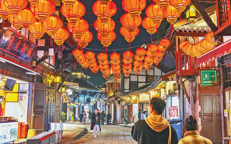 1月13日晚,沙坪壩區(qū)磁器口古鎮(zhèn)景區(qū),迎春燈飾點(diǎn)亮,別具一番韻味。