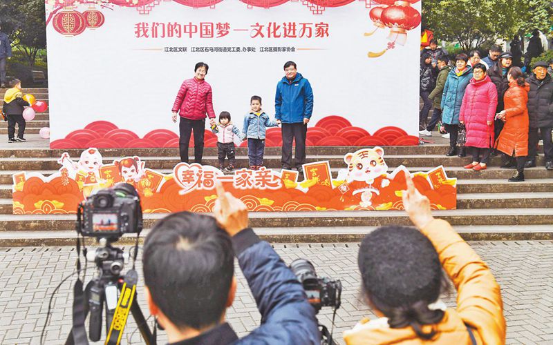 1月15日,江北區(qū)石馬河街道盤溪路,該區(qū)攝影家協(xié)會(huì)的志愿者正在給居民拍攝全家福。