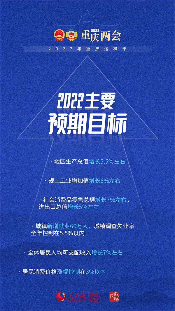 17日上午,重慶市第五屆人民代表大會第五次會議在重慶市人民大禮堂開幕。重慶市人民政府代市長胡衡華作政府工作報告。2022年重慶有哪些發(fā)展目標?有什么工作安排?人民網(wǎng)重慶頻道用一組海報帶你速看。