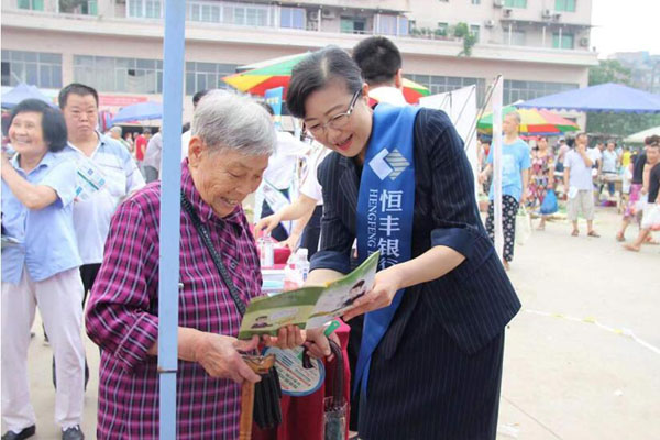 送金融知識(shí)進(jìn)鄉(xiāng)鎮(zhèn),鄒敏(右一)為群眾講解金融知識(shí)。恒豐銀行重慶分行供圖
