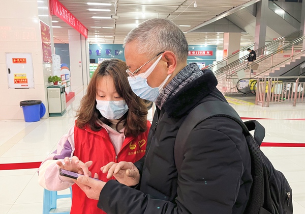 在雙鳳橋交通換乘樞紐,“站小青”志愿者協(xié)助開展春運(yùn)首日的旅客引導(dǎo)工作,幫助無法出示渝康碼的旅客登記信息,宣傳疫情防控相關(guān)要求,提供旅客進(jìn)站取票、綜合咨詢服務(wù)。