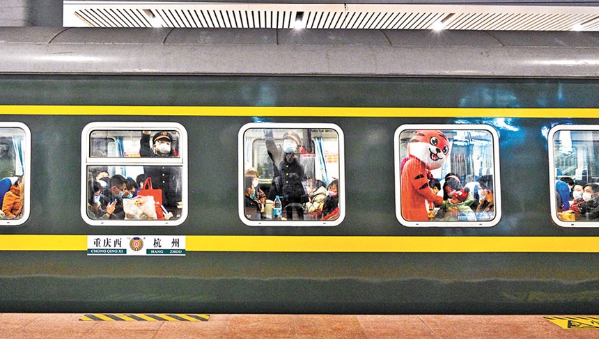 1月17日,重慶西站,春運(yùn)志愿者裝扮成卡通虎與出行的小朋友們熱情打招呼,祝福他們新春快樂。當(dāng)日是2022年鐵路春運(yùn)首日,重慶客運(yùn)段組織青年志愿者到車廂為旅客服務(wù),讓旅客出行更溫馨更便捷。通訊員 鐘潔 攝/視覺重慶