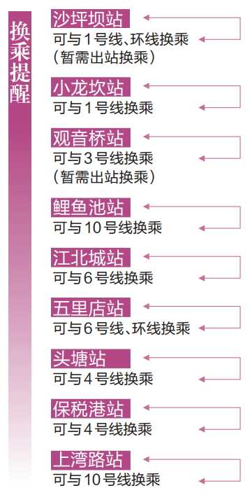 軌道交通9號(hào)線一期起于新橋站,止于興科大道站,全長約33公里,共計(jì)26座車站。本次計(jì)劃開通23座車站,分別是:高灘巖站、天梨路站、沙坪壩站、小龍坎站、土灣站、紅巖村站、富華路站、化龍橋站、李家坪站、螞蝗梁站、觀音橋站、鯉魚池站、劉家臺(tái)站、江北城站、五里店站、溉瀾溪站、頭塘站、保稅港站、何家梁站、石盤河站、上灣路站、青崗坪站、興科大道站。郵輪母港站、寶圣湖站、新橋站暫不開通。