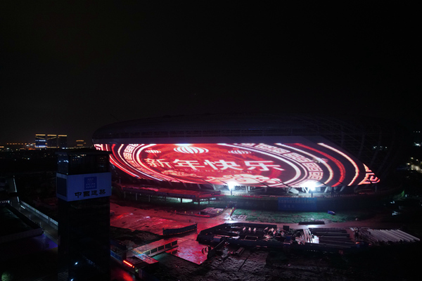 重慶龍興足球場(chǎng)項(xiàng)目12000平方米特大LED光電幕墻順利亮燈。中建八局供圖