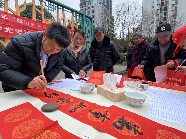 在現(xiàn)場(chǎng),轄區(qū)共建單位書法老師還和社區(qū)老黨員們一起為居民寫春聯(lián),并邀請(qǐng)現(xiàn)場(chǎng)愛好書畫的居民一同書寫家風(fēng)家訓(xùn)和新年祝福。社區(qū)一名已退休居民表示:“在活動(dòng)中,居民間通過(guò)交流增進(jìn)了感情,將自己書寫的大紅春聯(lián)貼在家門口顯得特別有意義,感謝社區(qū)組織的活動(dòng)!