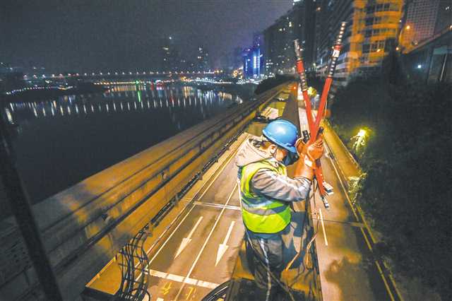 1月24日凌晨,軌道2號線黃花園段,李佳鑫正在軌道梁上進行驗電、裝設(shè)接地線等工作。首席記者 龍帆 攝/視覺重慶
