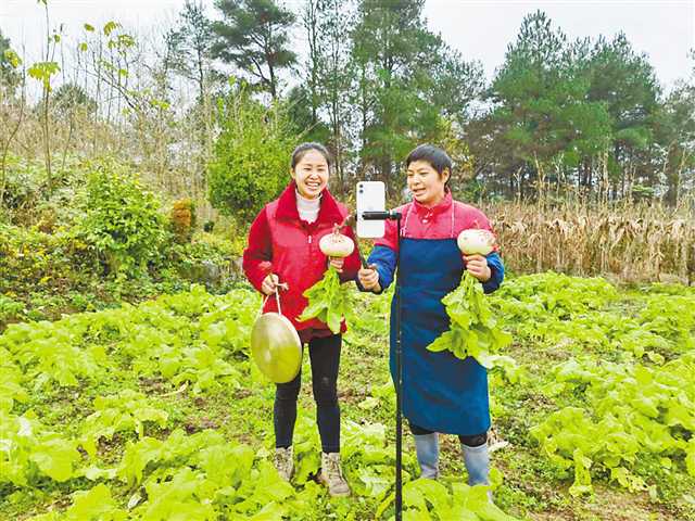 黃永會(huì)(右)正在和村干部一起直播帶貨。通訊員 張慶 攝/視覺重慶