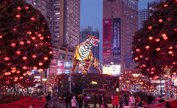 在三峽廣場轉(zhuǎn)了一大圈,燈飾確如楊佳所說,別致精美、恢弘大氣,獨(dú)具審美情趣,更點(diǎn)亮了夜空,照耀出年味。燈飾分為“金虎迎新開門紅”“詩意沙坪壩”“箏鳴琴瑟天下幽”“勿忘黃天厚土滋潤”四個主題部分,與商圈景觀結(jié)合,使用祈福燈、紅楓等多種燈飾及造型景觀,重現(xiàn)了虎嘯山林、花燈祈福、農(nóng)家風(fēng)情以及詩意沙坪壩等多重景象。