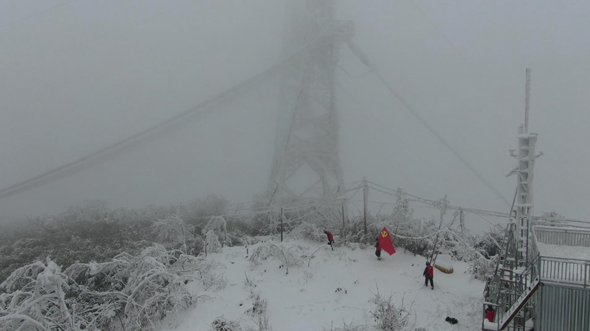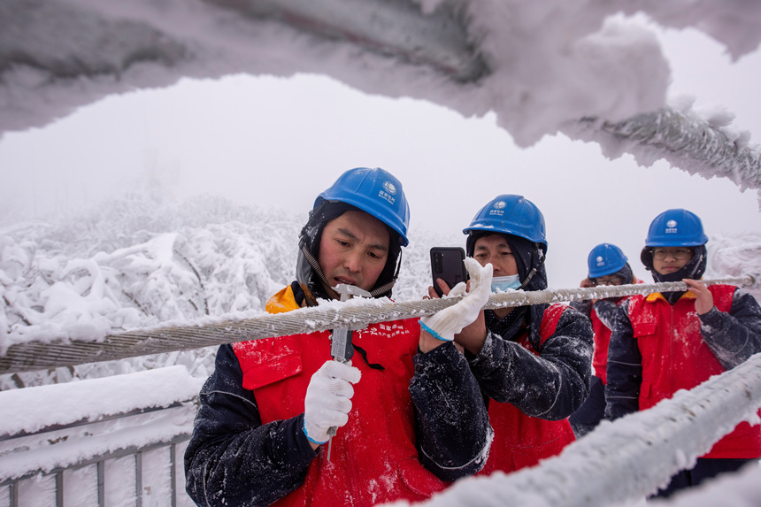 國網(wǎng)重慶城口供電公司員工楊順安、冉昊天在220千伏華城線237號塔測量覆冰厚度。牟丹陽攝