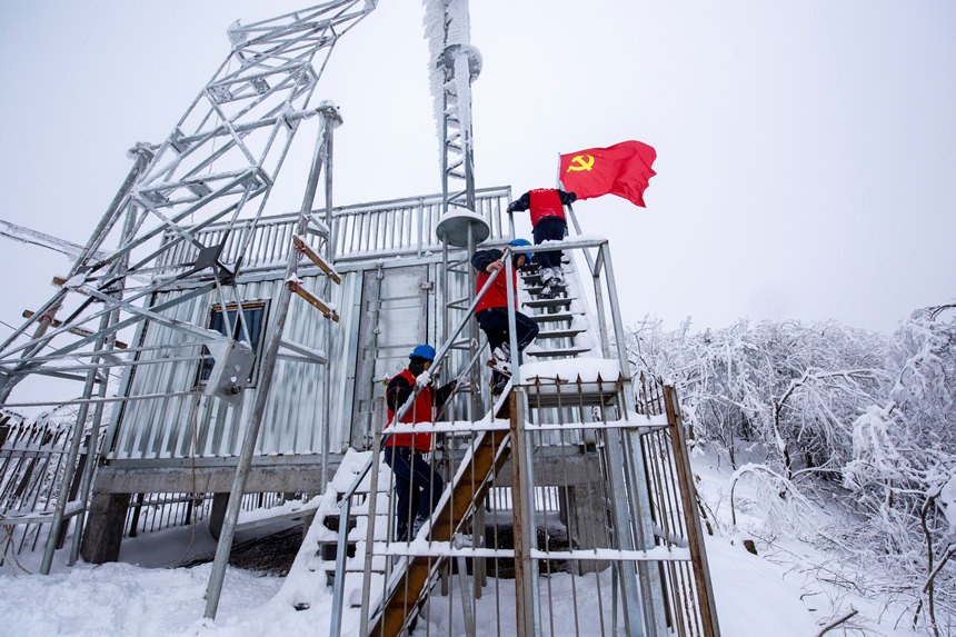 國家電網(wǎng)紅巖(城口)共產(chǎn)黨員服務(wù)隊在前往220千伏華城線237號塔觀冰點。牟丹陽攝