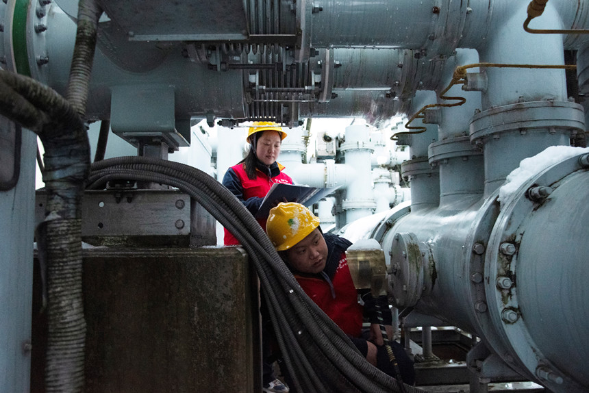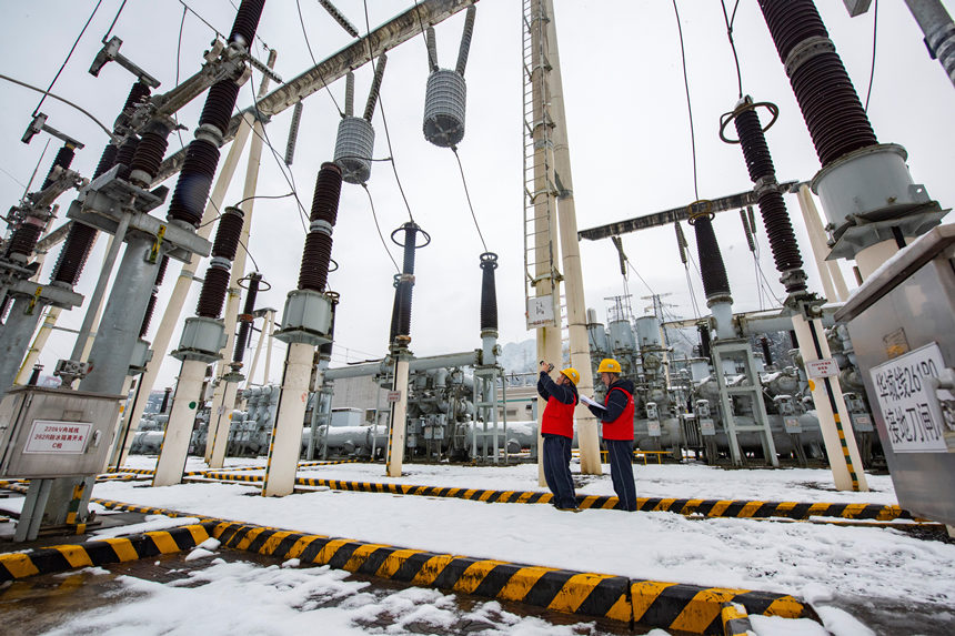 國網(wǎng)重慶城口供電公司員工程渝、劉家豪在220千伏集控站對融冰裝置進(jìn)行紅外測溫。牟丹陽攝