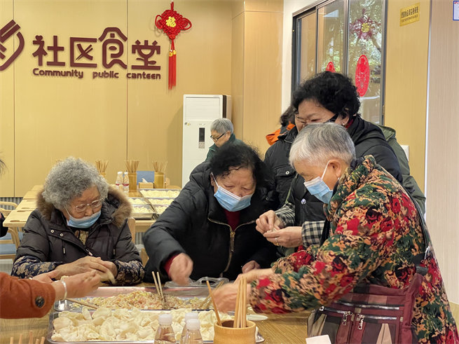 老人們?cè)谏鐓^(qū)食堂包餃子、話家常,慶祝虎年的到來。李詩韻攝