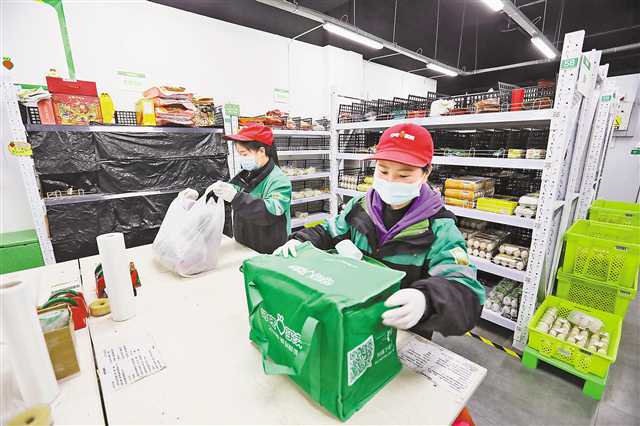 1月28日,叮咚買菜觀音橋門店,何艷玲(右)正在倉庫快速地進(jìn)行打包。記者 羅斌 攝/視覺重慶