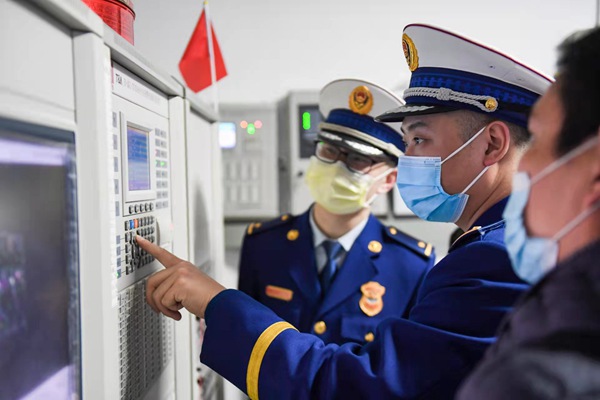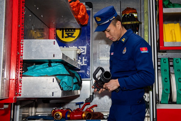 在順江特勤站交接班上,石亞斌認(rèn)真檢查一號(hào)車水槍。張龍攝