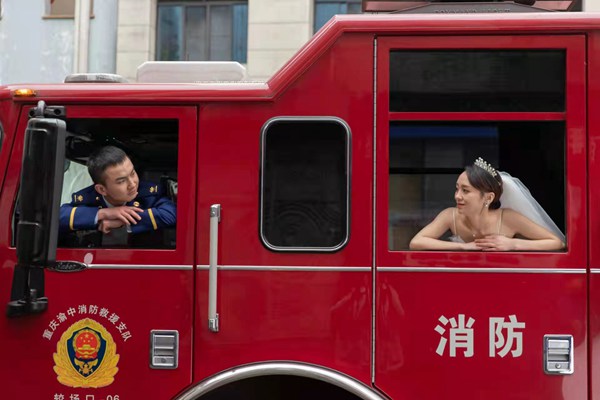 王飛在重慶市渝中區(qū)較場口消防救援站拍攝的婚紗照。受訪者供圖