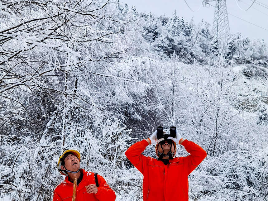 電力巡線工人用望遠(yuǎn)鏡對(duì)輸電線路覆冰情況進(jìn)行監(jiān)測。羅一靈攝