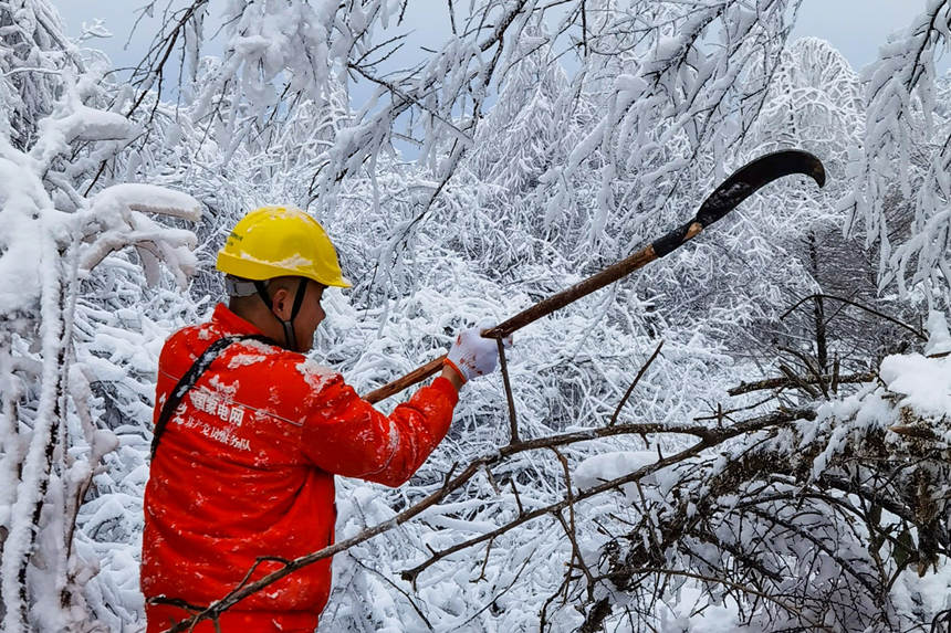 電力巡線工人對(duì)線路樹障進(jìn)行清除。羅一靈攝