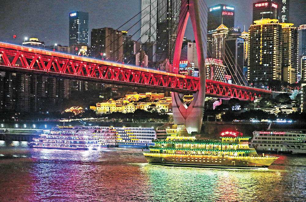2月5日晚,觀景游輪行駛在東水門大橋下。虎年春節(jié),不少市民和外地游客選擇乘坐兩江游輪觀賞兩江四岸迎春燈飾,喜慶夢幻的光影贏得點贊。 特約攝影 鐘志兵/視覺重慶