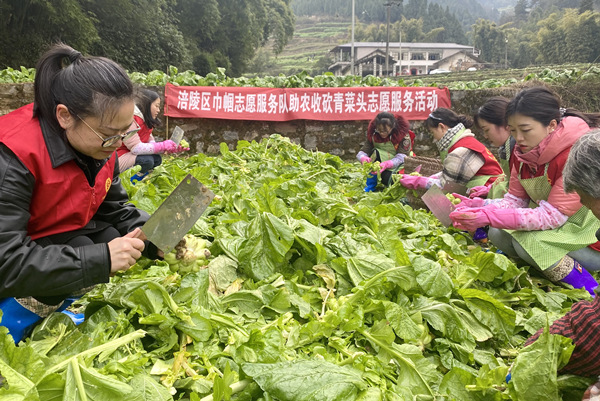 人民網(wǎng)重慶2月8日電 2月7日,新春佳節(jié)后上班第一天,涪陵區(qū)婦聯(lián)組織巾幗志愿者到江東街道涼水村3組何桂勇家,幫他收砍青菜頭。