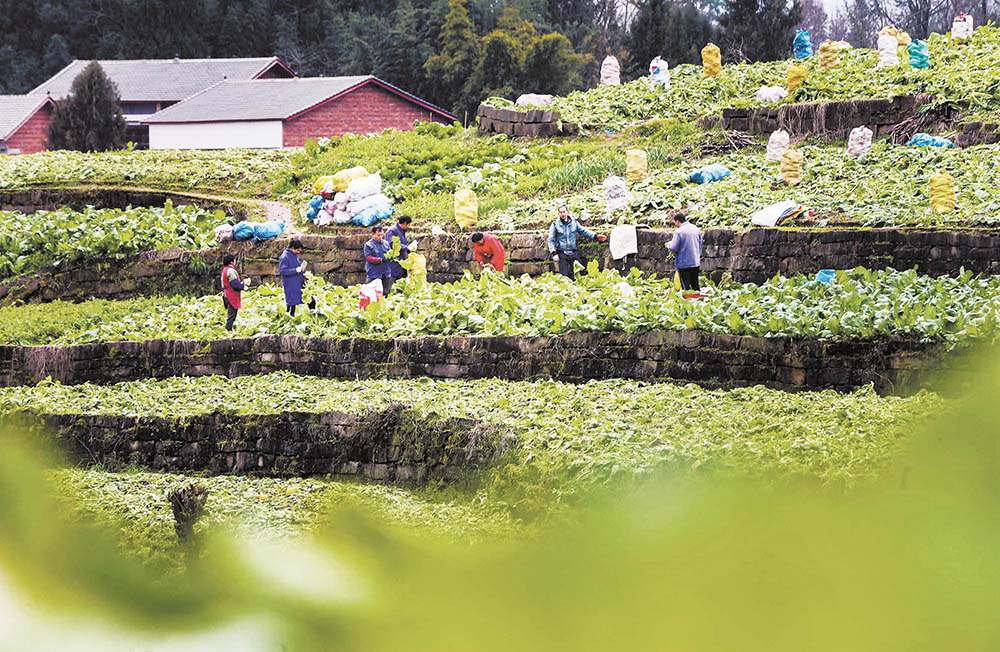 2月7日,在墊江縣坪山鎮(zhèn)田間地頭,到處是青菜頭收割的紅火景象。特約攝影 向曉秋/視覺(jué)重慶