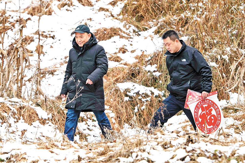 2月7日,萬(wàn)州區(qū)恒合鄉(xiāng)白雪皚皚,鄉(xiāng)村振興工作隊(duì)員頂著風(fēng)雪走訪村民。特約攝影 冉孟軍/視覺(jué)重慶