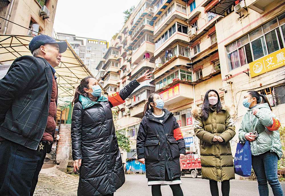 2月7日,兩江新區(qū)邢家橋社區(qū)人和家園小區(qū),社區(qū)黨委書(shū)記謝蘭(左二)和社區(qū)干部向居民宣傳老舊小區(qū)改造方案。記者 張錦輝 攝/視覺(jué)重慶