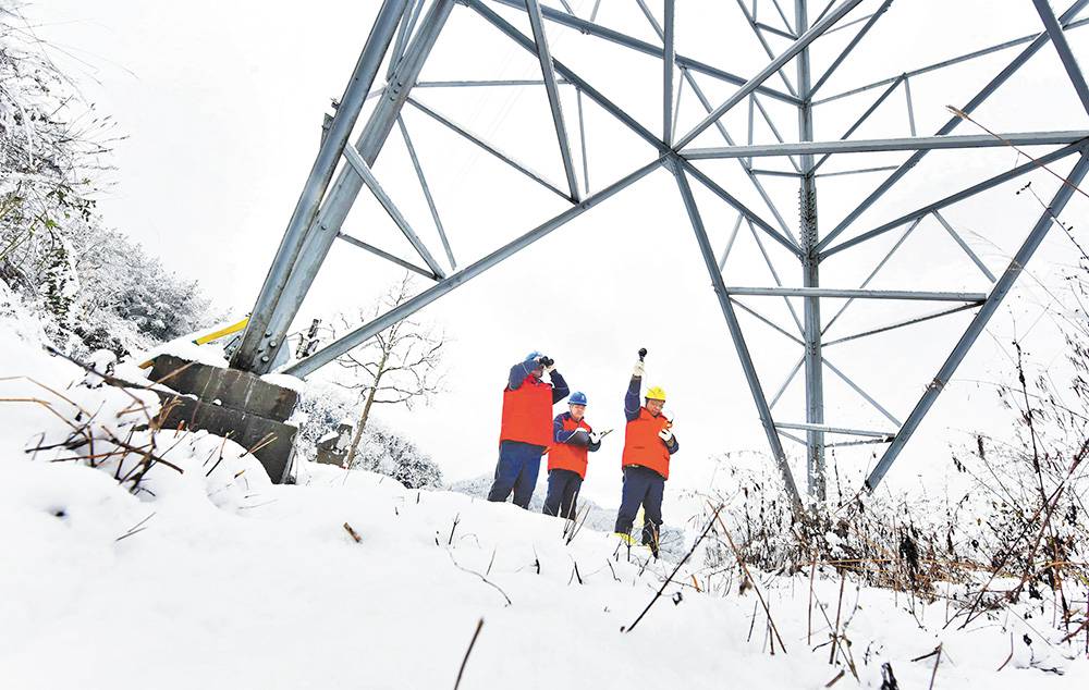 2月7日,國(guó)網(wǎng)重慶電力紅巖酉陽(yáng)自治縣供電公司輸電運(yùn)檢專業(yè)人員,對(duì)110千伏陽(yáng)城北線進(jìn)行覆冰觀測(cè),排查線路覆冰隱患。特約攝影 陳碧生/視覺(jué)重慶