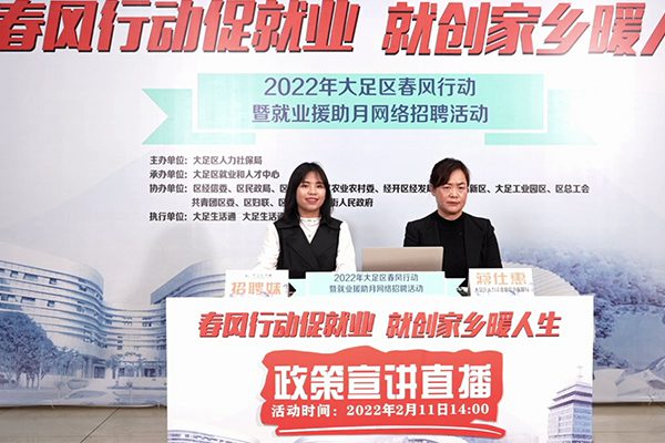 2月10日-11日,重慶市大足區(qū)人力社保局在重慶大足人力資源服務產(chǎn)業(yè)園舉辦以“春風行動促就業(yè) 就創(chuàng)家鄉(xiāng)暖人生”為主題的2022年春風行動暨就業(yè)援助月網(wǎng)絡直播招聘暨政策宣講活動。