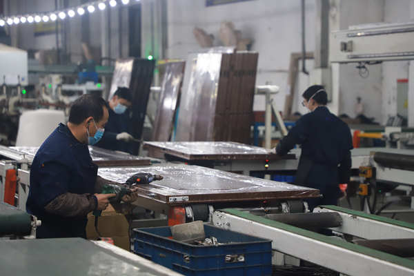 一扇扇門在生產(chǎn)線上通過傳送帶自動傳送,然后依次完成鈑金、扣合、熱壓、裝配等生產(chǎn)環(huán)節(jié),這個原本需要150人同時作業(yè)的生產(chǎn)線,經(jīng)過智能化改造后,現(xiàn)在只需25個工人就能完成操作,且生產(chǎn)效率提高了一倍。