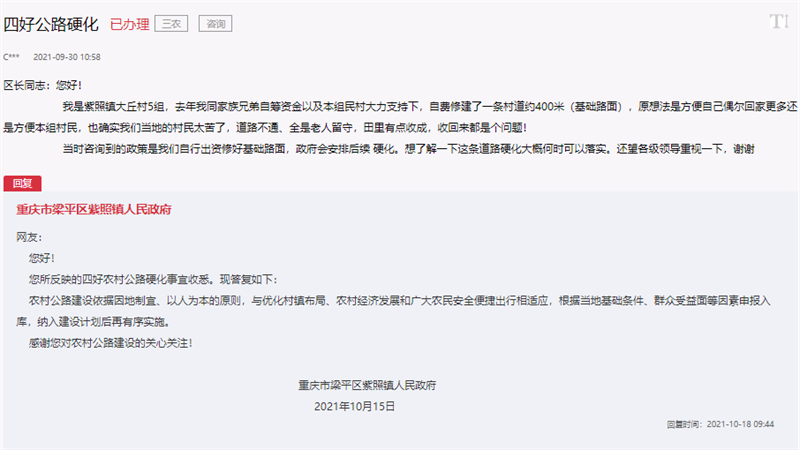 原來,2021年9月30日,這名網(wǎng)友在人民網(wǎng)“領(lǐng)導(dǎo)留言板”留言反映,他們家族兄弟于2020年自籌資金,在本組村民的支持下,自費(fèi)修建了一條約400米的村道(基礎(chǔ)路面)。當(dāng)時(shí)了解到的政策是村民自行出資修好基礎(chǔ)路面后,政府會(huì)安排后續(xù)硬化。想了解一下這條道路硬化大概何時(shí)可以落實(shí)?