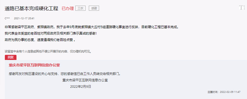 留言中,這位網(wǎng)友說道:“非常感謝梁平區(qū)政府、紫照鎮(zhèn)政府。我于2021年9月底就紫照鎮(zhèn)大丘村5組道路硬化事宜進(jìn)行反映,目前硬化工程已基本完成!睂Υ,他代表村里受益的老百姓對相關(guān)部門表示真誠的感謝!