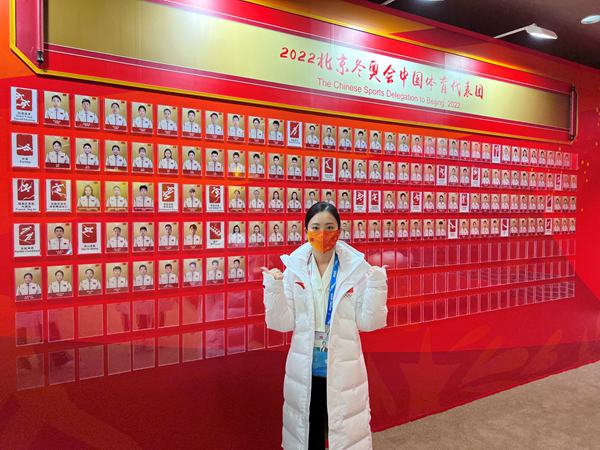 馮詩(shī)詩(shī)在中國(guó)體育代表團(tuán)展示墻前的留影。受訪者供圖