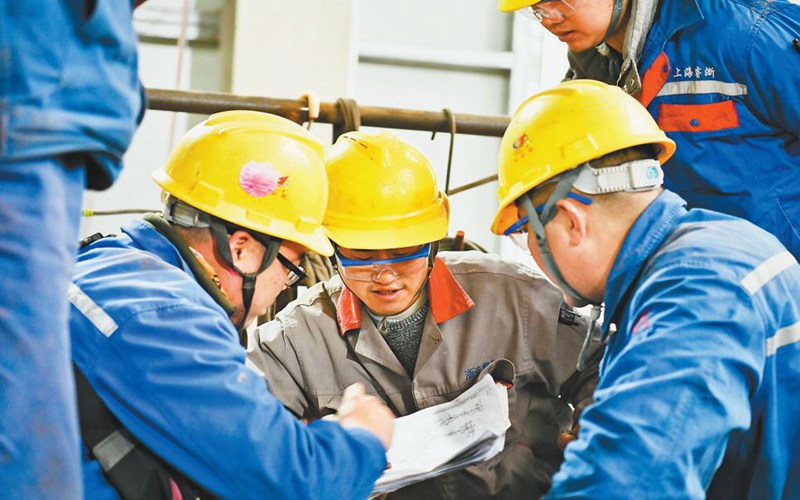 2月8日,長壽經(jīng)開區(qū),中化學(xué)華陸新材料有限公司30萬方/年硅基氣凝膠復(fù)合材料項目現(xiàn)場,工人正在探討圖紙內(nèi)容。