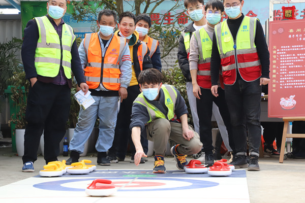 活動(dòng)現(xiàn)場(chǎng),既有感受傳統(tǒng)文化的猜燈謎,又有互動(dòng)感極強(qiáng)的趣味運(yùn)動(dòng):“在悅來,愛悅來,一起向未來”拼圖游戲,參賽組全力合作以最短時(shí)間展現(xiàn)悅來中心項(xiàng)目效果圖,鼓勵(lì)大家為項(xiàng)目建設(shè)作貢獻(xiàn);“攜手同行,‘悅’來越好”——旱地冰壺游戲讓工友們?cè)诠さ馗惺艿竭\(yùn)動(dòng)的樂趣;“團(tuán)結(jié)就是力量”——安全帶拔河比賽以安全帶為紐帶,獨(dú)具工地特色,在趣味運(yùn)動(dòng)中提升安全意識(shí)。同時(shí),還有“聲聲報(bào)! “團(tuán)團(tuán)圓圓(夾元宵)”“套圈”等游戲,各項(xiàng)活動(dòng)在歡快喜慶的氣氛中秩序井然地進(jìn)行,活動(dòng)現(xiàn)場(chǎng)到處洋溢著喜悅和歡聲笑語。
