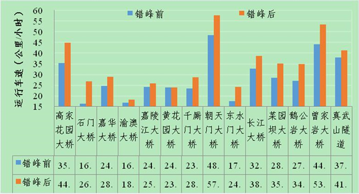 二是錯(cuò)峰橋隧高峰時(shí)段平均車速為34.4公里/小時(shí),較錯(cuò)峰前同比提升20.2%,其中高家花園大橋及復(fù)線橋、朝天門大橋、曾家?guī)r大橋等高峰時(shí)段車速平均提升超過(guò)9公里/小時(shí)。
