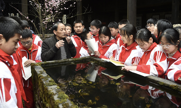 人民網(wǎng)重慶2月17日電 “這個石墩上面雕刻的是核桃仁,代表做人要仁義”“這上面刻了一首《陋室銘》,表示當時的主人希望他的后人做人要低調(diào),生活要簡樸,懂得節(jié)約”。2月17日,新學期開學第二天,涪陵區(qū)青羊鎮(zhèn)陳萬寶莊園內(nèi),青羊鎮(zhèn)文化服務(wù)中心負責人熊中圣正在給涪陵六中的學生們宣傳講解陳萬寶莊園所蘊含的傳統(tǒng)文化內(nèi)涵,并教導孩子們做人的道理。