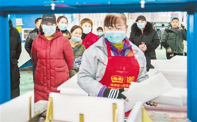 2月22日,在位于重慶高新區(qū)走馬鎮(zhèn)的日鑫包裝制品廠,求職人員正在觀看工人的操作。
