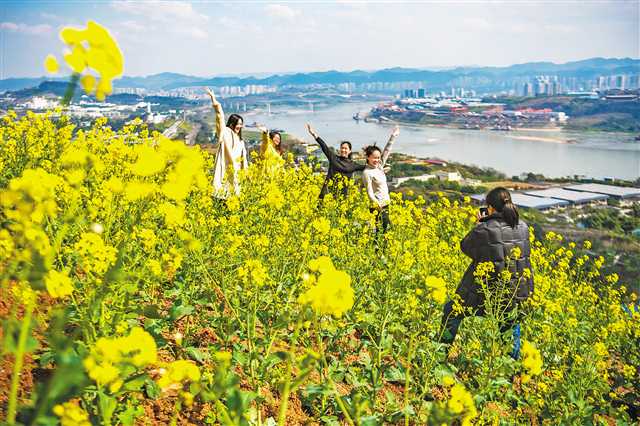 2月23日,大渡口區(qū)跳磴鎮(zhèn)石盤村金鰲田園,市民正在漫山的油菜花田中感受春天的氣息。