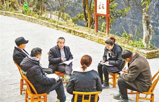 二月十五日,巫山縣竹賢鄉(xiāng)下莊村,毛相林(左三)和村干部及駐村干部開(kāi)院壩會(huì)謀劃工作。