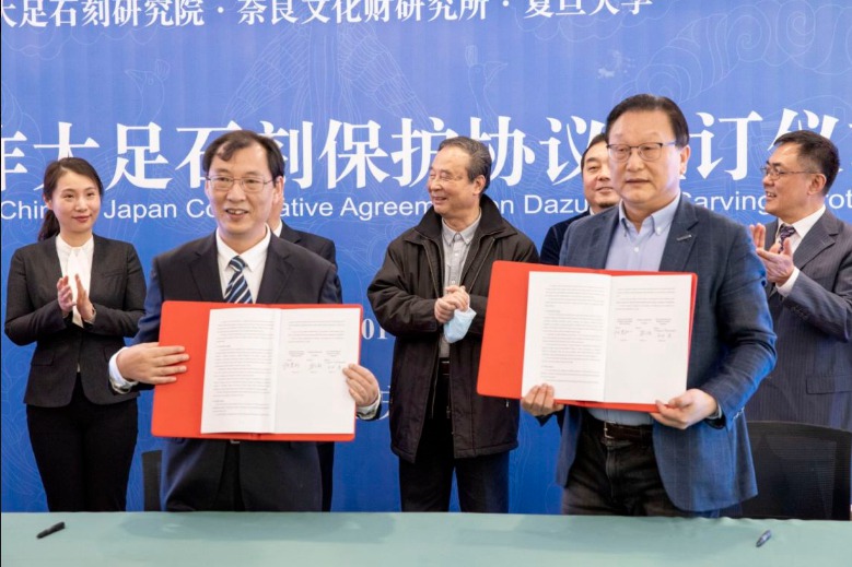 人民網(wǎng)重慶3月2日電 為全面提升大足石刻保護基礎與理論研究水平,推進石窟寺科技保護及預防性保護工作,3月1日,大足石刻研究院、復旦大學、日本奈良文化財研究所通過在線視頻方式分別在重慶市大足區(qū)和日本奈良市舉行中日合作大足石刻保護協(xié)議簽訂儀式。