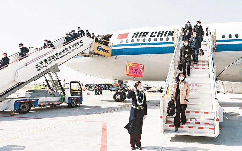 3月3日,在渝全國人大代表和住渝全國政協(xié)委員抵達(dá)北京,正式進(jìn)入“兩會(huì)時(shí)間”。全國兩會(huì)是察大勢(shì)、應(yīng)變局、觀未來的重要平臺(tái)。代表委員們表示,將認(rèn)真履職,建真言、謀良策、出實(shí)招,為保持平穩(wěn)健康的經(jīng)濟(jì)環(huán)境、國泰民安的社會(huì)環(huán)境、風(fēng)清氣正的政治環(huán)境作出貢獻(xiàn)。圖為出席十三屆全國人大五次會(huì)議的重慶代表團(tuán)抵達(dá)北京。