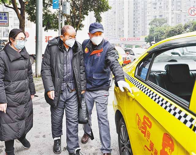 大渡口春暉路街道古渡春色小區(qū)門口,“雷鋒的士”志愿者和街道工作人員接送援鄂醫(yī)護人員家屬(右二)到醫(yī)院。(本報資料圖片)記者 齊嵐森 攝/視覺重慶