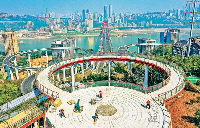 3月7日,南岸區(qū)蘇家壩步道觀景平臺施工現(xiàn)場,觀景平臺和步道主體已完工,工人正加緊綠化和裝飾收尾工作。