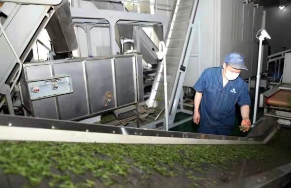 人民網(wǎng)重慶3月15日電 在永川區(qū)的一家茶業(yè)公司生產(chǎn)車間內(nèi),伴隨著機(jī)械的轟鳴聲,工人們?cè)跇?biāo)準(zhǔn)化的生產(chǎn)作業(yè)線上,忙碌地進(jìn)行鮮葉殺青、揉捻、干燥、智能色選等工序,“永川秀芽”的幽香飄滿了整個(gè)生產(chǎn)車間。