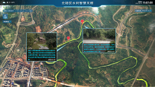 在北碚區(qū)河長辦看到,“北碚區(qū)水利智慧天眼”的衛(wèi)星影像圖片通過高空視角,將轄區(qū)內(nèi)河流都呈現(xiàn)在屏幕上,并通過不同顏色標記展示河流的水質(zhì)情況。如果標記的顏色為紅色,那么表明該處存在河水遭遇污染的情況。