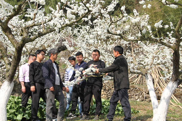院壩里的笑聲感染了周圍鄰居、駐村干部和村社干部,不一會兒就擠滿了人,大家請兩位專家到開花的果樹下,示范怎么復剪,請教如果有倒春寒,怎么提前應對,下一步怎么疏果、怎么防雨避災。